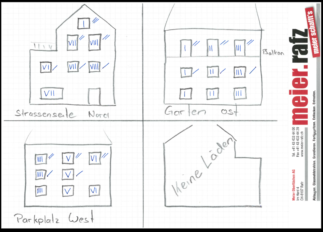 Für diesen Fall stellen wir Ihnen gerne unsere Metallschilder mit fortlaufender Nummerierung gegen einen geringen Preis zur Verfügung. Diese werden mit einem dicken Draht am Fensterladen gut befestigt.